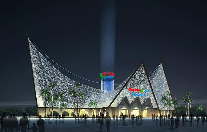 馬來西亞友誼之舟,通過將兩座東南亞地區(qū)傳統(tǒng)船屋為原型的體量進(jìn)行穿插結(jié)合,融入大量馬來西亞當(dāng)?shù)貍鹘y(tǒng)元素,一舉贏得馬來西亞國家館國際投標(biāo),并最終得以實(shí)施。該項(xiàng)目建筑建筑面積5 000m2,為地上2 層結(jié)構(gòu)。