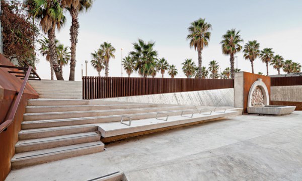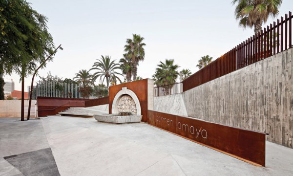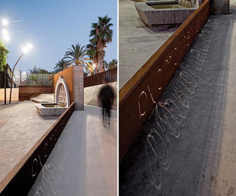 廣場(chǎng)邊有一個(gè)斜坡,縱長(zhǎng)的臺(tái)階緩慢傾斜,漸漸地都與斜坡融為一體。舞者Carmen Amaya的名字被篆刻在一塊克爾頓鋼板上,被擺放在最顯眼的位置。